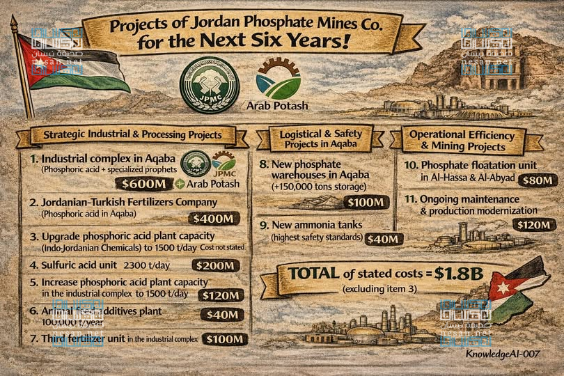 وفي مقدمة هذه المشاريع، يأتي إنشاء مجمّع صناعي متكامل في العقبة لإنتاج حامض الفوسفوريك والأسمدة الفوسفاتية المتخصصة بالشراكة مع شركة البوتاس العربية، بكلفة تقارب 600 مليون دولار، إلى جانب تأسيس الشركة الأردنية التركية للأسمدة لإنتاج حامض الفوسفوريك بكلفة تصل إلى 400 مليون دولار، ما يعزز الشراكات الإقليمية ويفتح أسواقاً جديدة للمنتج الأردني.