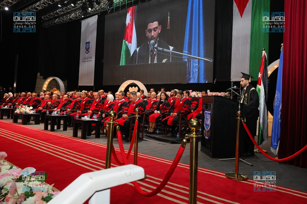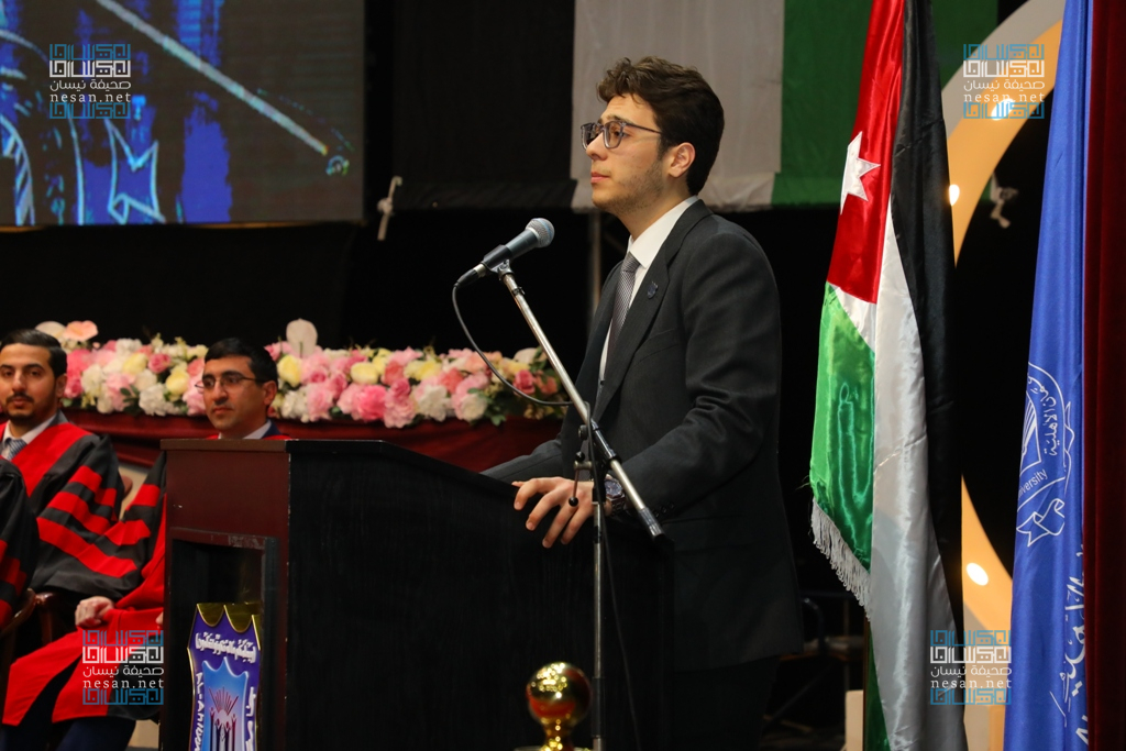 أقف أمامكم اليوم ممثلاً لزملائي الخريجين، ممتناً لهذه اللحظة العظيمة، متقدماً بجزيل الشكر لدولة الرئيس عبد الكريم الكباريتي رئيس مجلس الأمناء، وللأستاذ الدكتور ساري حمدان رئيس جامعة عمّان الأهلية، ولعطوفة الدكتور ماهر الحوراني رئيس هيئة المديرين، والسادة عمداء الكليات وأعضاء الهيئتين التدريسية والإدارية، على ما بذلوه من جهد ودعم حتى نصل إلى هذا اليوم.