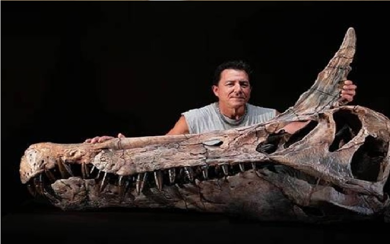 نيسان ـ عثر فريق علمي من جامعة شيكاغو على جمجمة ضخمة بحجم إنسان بالغ، تتميز بفك طويل شبيه بفك الزواحف، مليء بأسنان مدببة بحجم كف اليد، إضافة إلى خطم كبير يشبه خطم التمساح بشكل لافت.