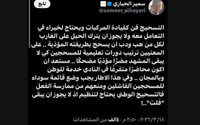 هذه هي الفقرة: التسحيج فن كقيادة المركبات ويحتاج لخبراء في التعامل معه ولا يجوز ان يترك الحبل على الغارب لكل من هب ودب ان يسحج بطريقته المؤذية .. على المعنيين ترتيب دورات تعليمية للمسحجين كي لا يبقى المشهد مضرًا مؤذيًا مضحكًا .. مستعد ان اكون محاضرًا متفرغًا في النادي خدمة للوطن وبالمجان .. وفي هذا الاطار يجب وضع قائمة سوداء للمسحجين الفاشلين ومنعهم من ممارسة الفعل فالتسحيج الوطني يحتاج لتنظيم اذ لا يجوز ان يبقى "فلت"..!