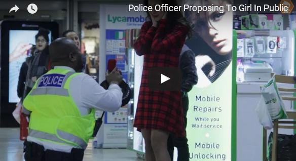 ويظهر الشرطي في مقطع الفيديو الذي تناقلته مواقع التواصل الاجتماعي على نحو واسع، وهو يندفع باتجاه امرأة داخل مجمع التسوق، قبل أن يعلن أمام المتسوقين في مركز وود غرين للتسوق شمال لندن عن رغبته بالتقدم للزواج منها.