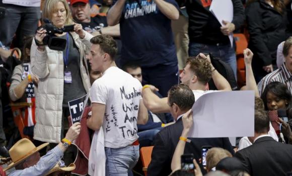 Critics have accused Trump of fueling the toxic atmosphere. On February 1, as protesters interrupted a rally in Iowa, he encouraged supporters to “knock the crap out of them,” and pledged to pay their legal fees.