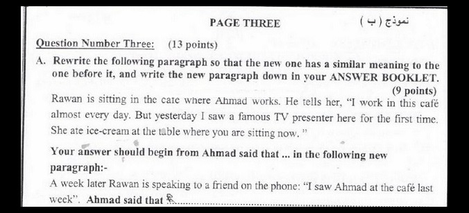 وقال الخبراء بأن من قام بكتابة أسئلة مبحث الانجليزي للتوجيهي بالامس لجؤوا إلى مواقع أجنبية، والدليل على ذلك هو السؤال الثالث في الامتحان والذي يطلب فيه واضع السؤال تحويل الجملة من الكلام المباشر الى غير المباشر ووضع على اجابته 9 علامات، حيث تم اخذ هذا السؤال من احدى المواقع الاجنبية لتعليم اللغة الانجليزية مع تغيير الاسماء من الاجنبية الى العربية.