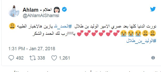 وقالت “أحلام” في تدوينة لها عبر حسابها لموقع التدوين المصغر “تويتر” رصدتها “وطن”:” نورت الدنيا كلها بعد عمري الامير الوليد بن طلال #الحمد_لله يازين هالاخبار الطيبه ياااااارب لك الحمد والشكر”.