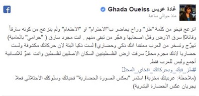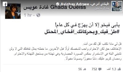 دخلت الإعلامية غادة عويس، المذيعة بقناة "الجزيرة" القطرية فى سجال على موقع "فيس بوك" مع المتحدث باسم جيش الاحتلال الإسرائيلى أفيخافى أدرعى، ساخرة من أسلوبه المعهود فى تهنئة المسلمين بشهر رمضان الكريم كل عام.